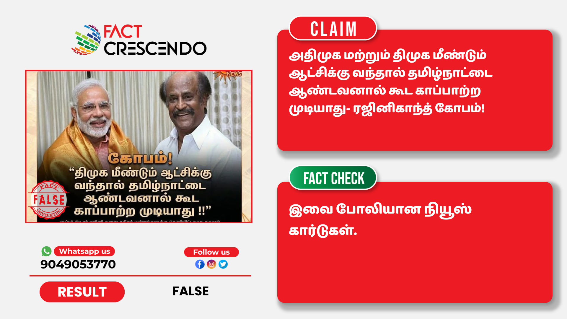 இதேபோன்று, அதிமுக மீண்டும் ஆட்சிக்கு வந்தால் தமிழ்நாட்டை ஆண்டவனால் கூட காப்பாற்ற முடியாது – ரஜினிகாந்த் கோபம் என்று கூறி மற்றொரு நியூஸ் கார்டும் பகிரப்படுகிறது.