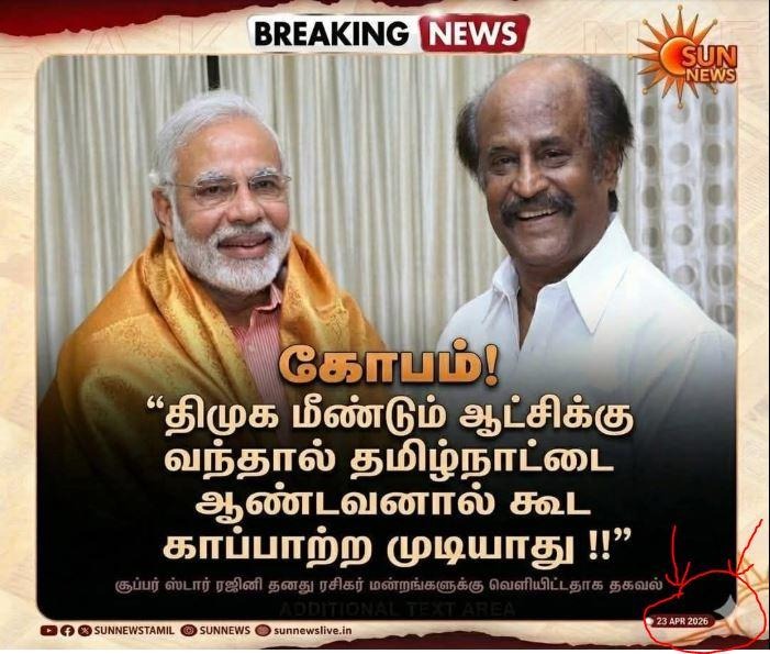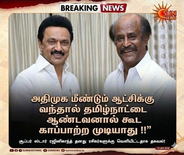 இதில், ‘’ திமுக மீண்டும் ஆட்சிக்கு வந்தால் தமிழ்நாட்டை ஆண்டவனால் கூட காப்பாற்ற முடியாது – ரஜினிகாந்த் கோபம்,’’ என்று எழுதப்பட்டுள்ளது.