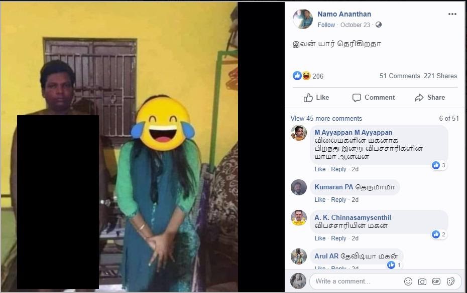உள்ளாடை மட்டும் அணிந்து நிற்கும் ஆணின் தலையை மாற்றி விடுதலைச் சிறுத்தைகள் கட்சித் தலைவர் தொல் திருமாவளவன் புகைப்படத்தை வைத்து எடிட் செய்து பகிர்ந்துள்ளனர். இவன் யார் தெரிகிறதா? என்று நிலைத் தகவலில் கேட்கப்பட்டுள்ளது. இந்த பதிவை, Namo Ananthan என்பவர் 2020 அக்டோபர் 23ம் தேதி பகிர்ந்துள்ளார். பலரும் இதை ஷேர் செய்து வருகின்றனர்.