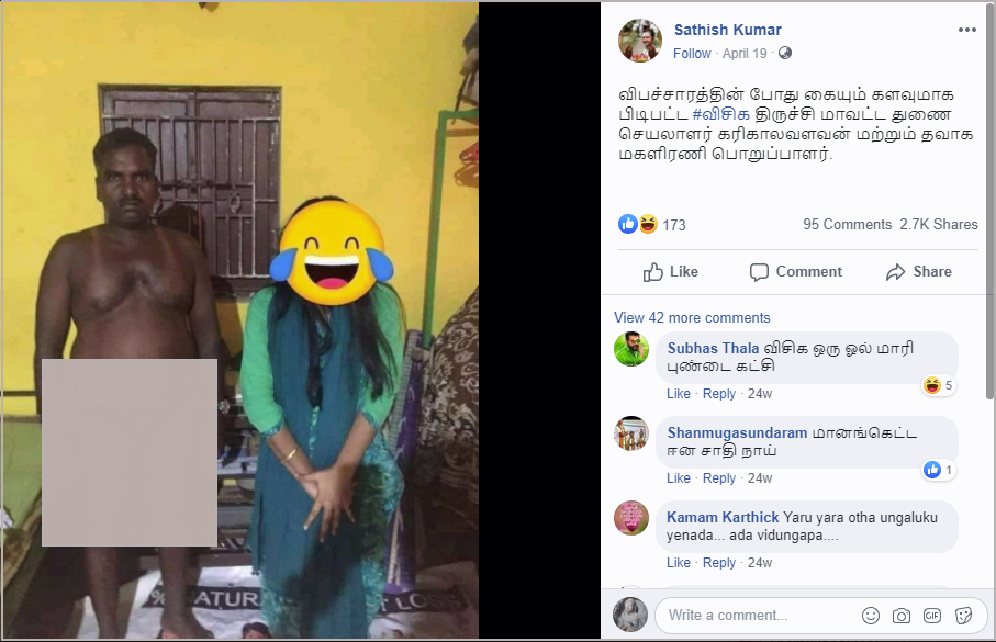 திருமாவளவனின் இளம் வயது புகைப்படம் எனக் கூறி எடிட் செய்யப்பட்ட மிகவும் ஆபாசமான முறையிலான புகைப்படம் ஒன்றை சமூக ஊடகங்களில் சிலர் பகிர்ந்து வருகின்றனர். இது பற்றிய ஆய்வை மேற்கொண்டோம்.