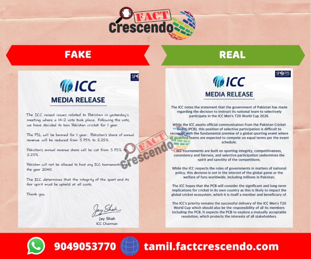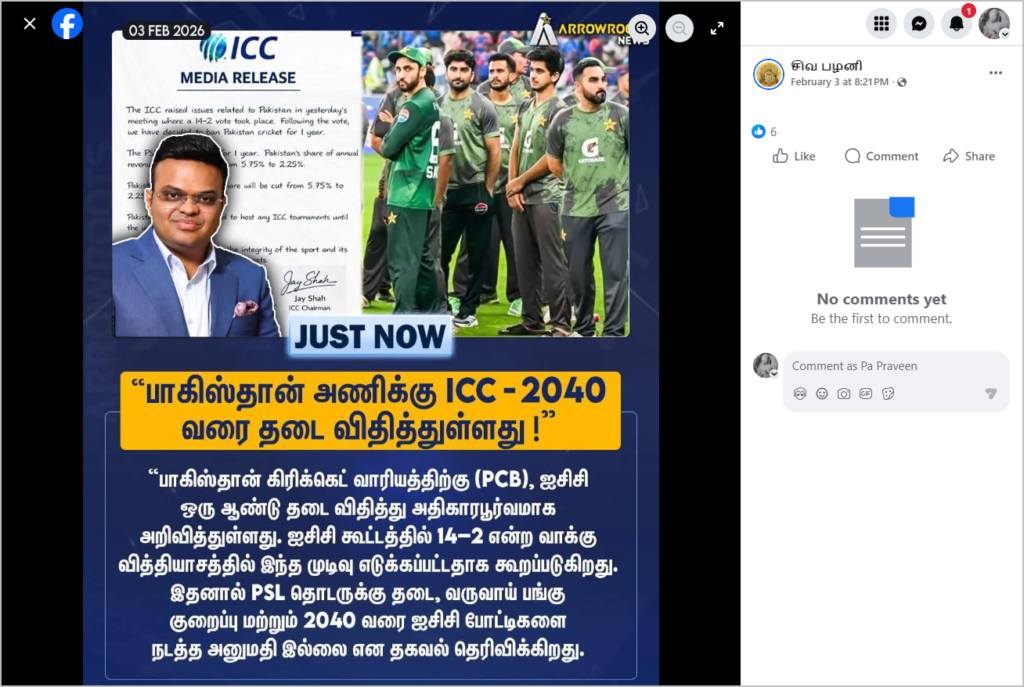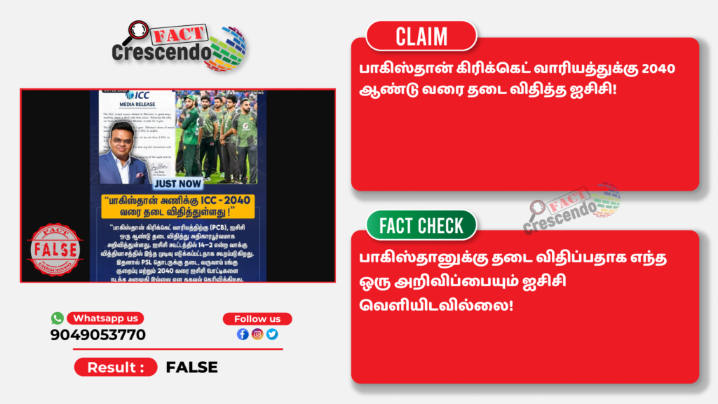 ஊடகங்கள் வெளியிடும் நியூஸ் கார்டு போல ஐசிசி பத்திரிகை செய்தி, ஐசிசி தலைவர் ஜெய்ஷா மற்றும் பாகிஸ்தான் கிரிக்கெட் வீரர்கள் புகைப்படத்துடன் பதிவு ஃபேஸ்புக்கில் வெளியிடப்பட்டுள்ளது. அதில், “பாகிஸ்தான் அணிக்கு ICC – 2040 வரை தடை விதித்துள்ளது! பாகிஸ்தான் கிரிக்கெட் வாரியத்திற்கு, ஐசிசி ஒரு ஆண்டு தடை விதித்து அதிகாரப்பூர்வமாக அறிவித்துள்ளது. ஐசிசி கூட்டத்தில் 14-2 என்ற வாக்கு வித்தியாசத்தில் இந்த முடிவு எடுக்கப்பட்டதாக கூறப்படுகிறது. இதனால் PSL தொடருக்கு தடை, வருவாய் பங்கு குறைப்பு மற்றும் 2040 வரை ஐசிசி போட்டிகளை நடத்த அனுமதி இல்லை என தகவல் தெரிவிக்கிறது” என்று குறிப்பிடப்பட்டிருந்தது. இந்த நியூஸ் கார்டை பலரும் சமூக ஊடகங்களில் பதிவிட்டு வருகின்றனர்.