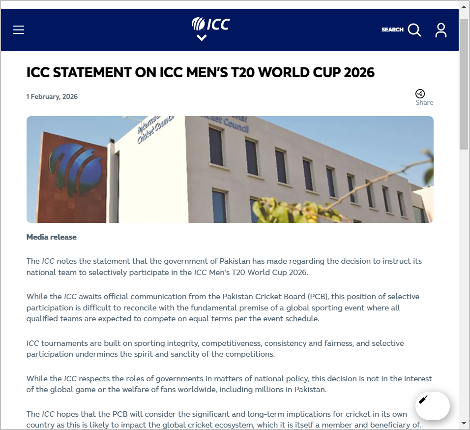 ஐசிசி இணையதளத்தில் பத்திரிகை செய்தி பகுதிக்கு சென்று சமீபத்தில் வெளியான பத்திரிகை செய்திகளை பார்த்தோம். டி20 உலகக் கோப்பை 2026 தொடர்பாக பிப்ரவரி 1ம் தேதி அறிக்கை வெளியாகி இருந்தது. அதைத் தவிர உலகக் கோப்பையின் ஏ, பி அணிகள் பற்றியும் 19 வயதுக்கு உட்பட்டவர்களுக்கான போட்டி தொடர்பான செய்திக் குறிப்புகள் இருந்தன. பிப்ரவரி 1ம் தேதி வெளியாகி இருந்த அறிக்கையில் பாகிஸ்தான் தொடர்பாக குறிப்பிடப்பட்டிருந்தது. அதிலும் பாகிஸ்தான் கிரிக்கெட் வாரியம் சுமுகமான முடிவை எடுக்கும் என்று நம்புவதாக ஐசிசி கூறியிருந்தது. அந்த அணிக்கு தடை விதிப்பதாக அதில் குறிப்பிடப்படவில்லை.