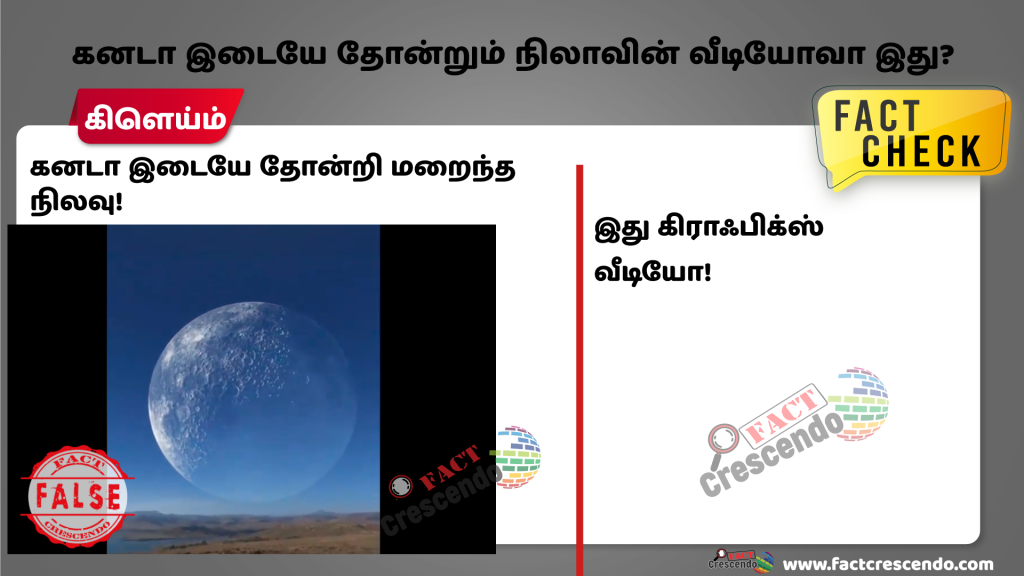 ரஷ்யா – கனடா இடையே தோன்றும் நிலாவின் தோற்றம் என்று பகிரப்படும் வீடியோ, கிராஃபிக்ஸ் முறையில் உருவாக்கப்பட்டது என்பதை தகுந்த ஆதாரங்களுடன் ஃபேக்ட் கிரஸண்டோ உறுதி செய்துள்ளது. எனவே, நமது வாசகர்கள், இத்தகைய தவறான செய்தி, புகைப்படங்கள், வீடியோ போன்றவற்றை உறுதி செய்யாமல் மற்றவர்களுக்குப் பகிர வேண்டாம் என கேட்டுக் கொள்கிறோம். வாசகர்கள் தங்களுக்கு சந்தேகம் என்று தோன்றும் தகவல், பதிவு, புகைப்படம், வீடியோவை எங்களது வாட்ஸ் ஆப் எண்ணிற்கு (+91 9049053770) அனுப்பினால், அதுபற்றி ஆய்வு செய்து உண்மை விவரத்தை வெளியிடுகிறோம்.