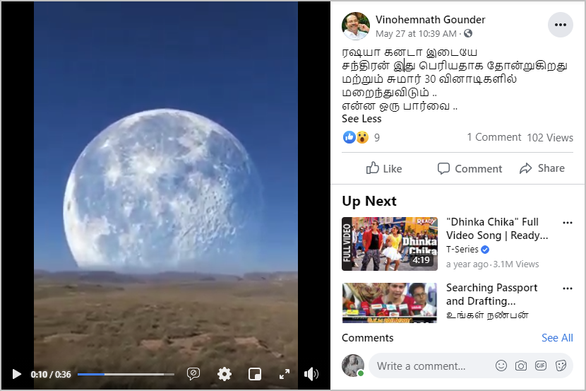 நிலா மிக நெருக்கமாக, மிகப் பெரியதாக தெரியும் வீடியோ பகிரப்பட்டுள்ளது. ஒரு சில விநாடிகள் மட்டும்தான் நிலவு வருகிறது. வந்த வேகத்தில் மறைந்துவிடுகிறது. நிலைத் தகவலில், “ரஷ்யா கனடா இடையே சந்திரன் இது பெரியதாக தோன்றுகிறது மற்றும் சுமார் 30 வினாடிகளில் மறைந்துவிடும் .. என்ன ஒரு பார்வை ..” என்று குறிப்பிடப்பட்டுள்ளது. இந்த வீடியோவை Vinohemnath Gounder என்பவர் 2021 மே 27ம் தேதி பதிவிட்டுள்ளார். பலரும் இதை ஷேர் செய்து வருகின்றனர்.