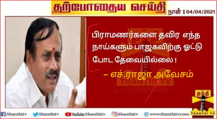 Title:பிராமணர் தவிர மற்றவர்களின் ஓட்டு தேவையில்லை என்று எச்.ராஜா பேசியதாகப் பரவும் வதந்தி…