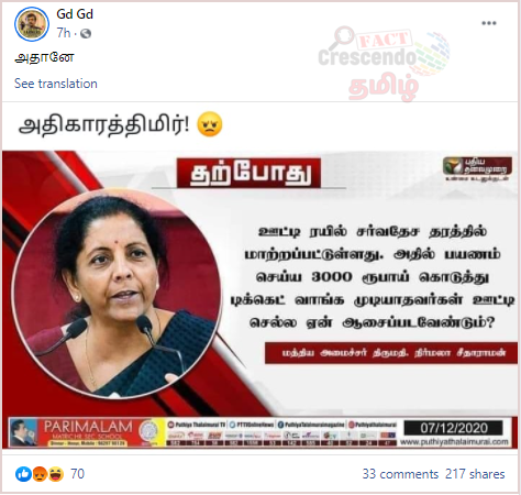 ‘’நிர்மலா சீதாராமன் ஊட்டி மலை ரயில் டிக்கெட் விலை உயர்வு பற்றி விமர்சனம்,’’ எனும் தலைப்பில் சமூக வலைதளங்களில் பகிரப்படும் தகவல் ஒன்றை காண நேரிட்டது. இதன் நம்பகத்தன்மை பற்றி ஆய்வு செய்ய தீர்மானித்தோம்.