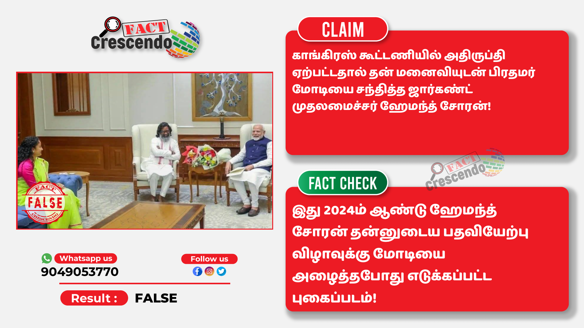 காங்கிரஸ் கூட்டணியில் அதிருப்தி ஏற்பட்டதால் தன் மனைவியுடன் பிரதமர் மோடியை சந்தித்த ஜார்கண்ட் முதலமைச்சர் ஹேமந்த் சோரன் என்று பரவும் புகைப்படம் 2024ம் ஆண்டு எடுக்கப்பட்டது என்பதை தகுந்த ஆதாரங்கள் அடிப்படையில் ஃபேக்ட் கிரஸண்டோ தமிழ் உறுதி செய்துள்ளது. எனவே, நமது வாசகர்கள், இத்தகைய தவறான செய்தி, புகைப்படங்கள், வீடியோ போன்றவற்றை உறுதி செய்யாமல் மற்றவர்களுக்குப் பகிர வேண்டாம் என கேட்டுக் கொள்கிறோம். வாசகர்கள் தங்களுக்கு சந்தேகம் என்று தோன்றும் தகவல், பதிவு, புகைப்படம், வீடியோவை எங்களது வாட்ஸ் ஆப் எண்ணிற்கு (+91 9049053770) அனுப்பினால், அதுபற்றி ஆய்வு செய்து உண்மை விவரத்தை வெளியிடுகிறோம்.