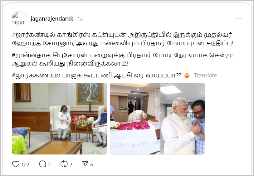 சில பதிவுகளில் சிபு சோரன் மறைவின் போது பிரதமர் நரேந்திர மோடி நேரில் வந்து அஞ்சலி செலுத்திய புகைப்படத்தையும் இணைத்து பதிவிடப்பட்டிருந்தது. அந்த பதிவுகளில், “ஜார்கண்டில் காங்கிரஸ் கட்சியுடன் அதிருப்தியில் இருக்கும் முதல்வர் ஹேமந்த் சோரனும், அவரது மனைவியும் பிரதமர் மோடியுடன் சந்திப்பு!