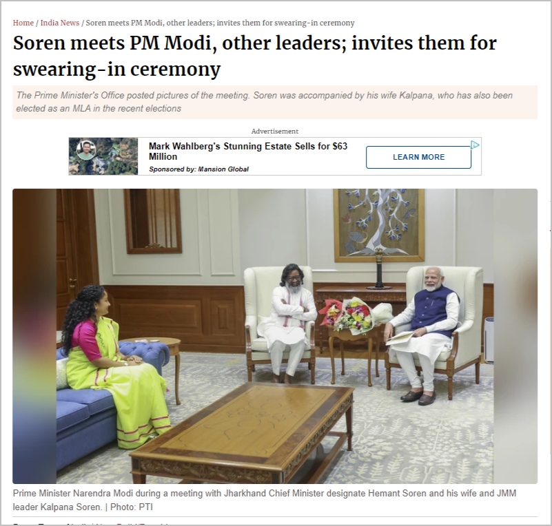புகைப்படத்தை கூகுள் லென்ஸ் தளத்தில் பதிவேற்றித் தேடினோம். அப்போது 2024ம் ஆண்டு ஜார்கண்ட் சட்டமன்ற தேர்தலில் வெற்றி பெற்ற பிறகு, அடுத்த முதல்வராக பொறுப்பேற்பதற்கு முன்பு பிரதமர் நரேந்திர மோடியை அவர் சந்தித்ததாக இந்த புகைப்படத்தை ஊடகங்கள் வெளியிட்டிருந்தன. ஜார்கண்ட் மாநில முதல்வராக பொறுப்பேற்க இருந்த ஹேமந்த் சோரன், தன்னுடைய பதவியேற்பு விழாவில் பங்கேற்கும்படி பிரதமர் நரேந்திர மோடிக்கு அழைப்பு விடுத்தார் என்று அந்த செய்திகளில் குறிப்பிடப்பட்டிருந்தது.