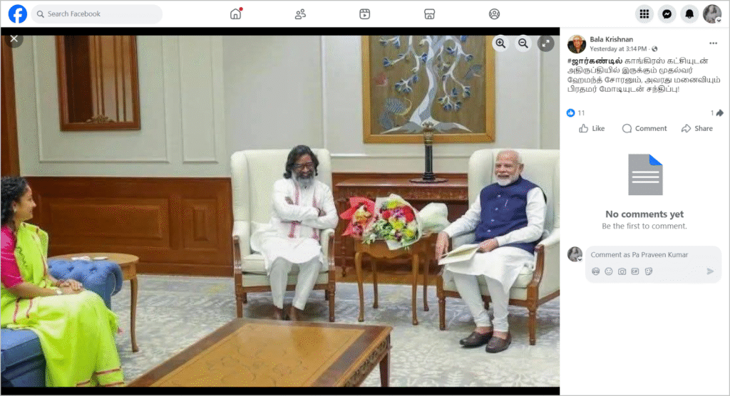 ஜார்கண்ட் முதலமைச்சர் ஹேமந்த் சோரன் தன் மனைவியுடன் பிரதமர் நரேந்திர மோடியை சந்தித்த புகைப்படம் ஃபேஸ்புக்கில் பதிவிடப்பட்டுள்ளது. நிலைத் தகவலில், “#ஜார்கண்டில் காங்கிரஸ் கட்சியுடன் அதிருப்தியில் இருக்கும் முதல்வர் ஹேமந்த் சோரனும், அவரது மனைவியும் பிரதமர் மோடியுடன் சந்திப்பு!” என்று குறிப்பிடப்பட்டிருந்தது.