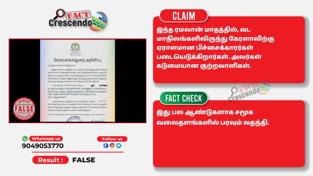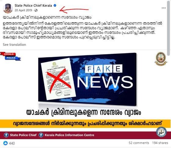 ‘‘பிச்சைக்காரர் வேடத்தில் கேரளாவிற்கு படையெடுத்துள்ள குற்றவாளிகள்,’’ என்று கூறி, சமூக வலைதளங்களில் பரவும் தகவல் பற்றி ஆய்வு மேற்கொண்டோம்.