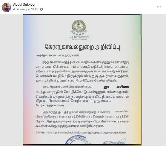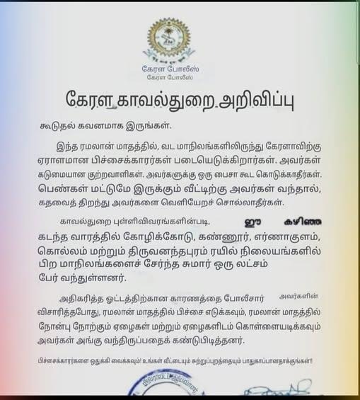 இந்த ரமலான் மாதத்தில், வட மாநிலங்களிலிருந்து கேரளாவிற்கு ஏராளமான பிச்சைக்காரர்கள் படையெடுக்கிறார்கள். அவர்கள் கடுமையான குற்றவாளிகள். அவர்களுக்கு ஒரு பைசா கூட கொடுக்காதீர்கள். பெண்கள் மட்டுமே இருக்கும் வீட்டிற்கு அவர்கள் வந்தால், கதவைத் திறந்து அவர்களை வெளியேறச் சொல்லாதீர்கள்.