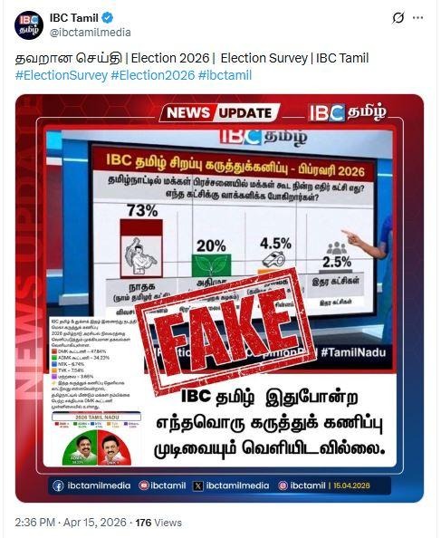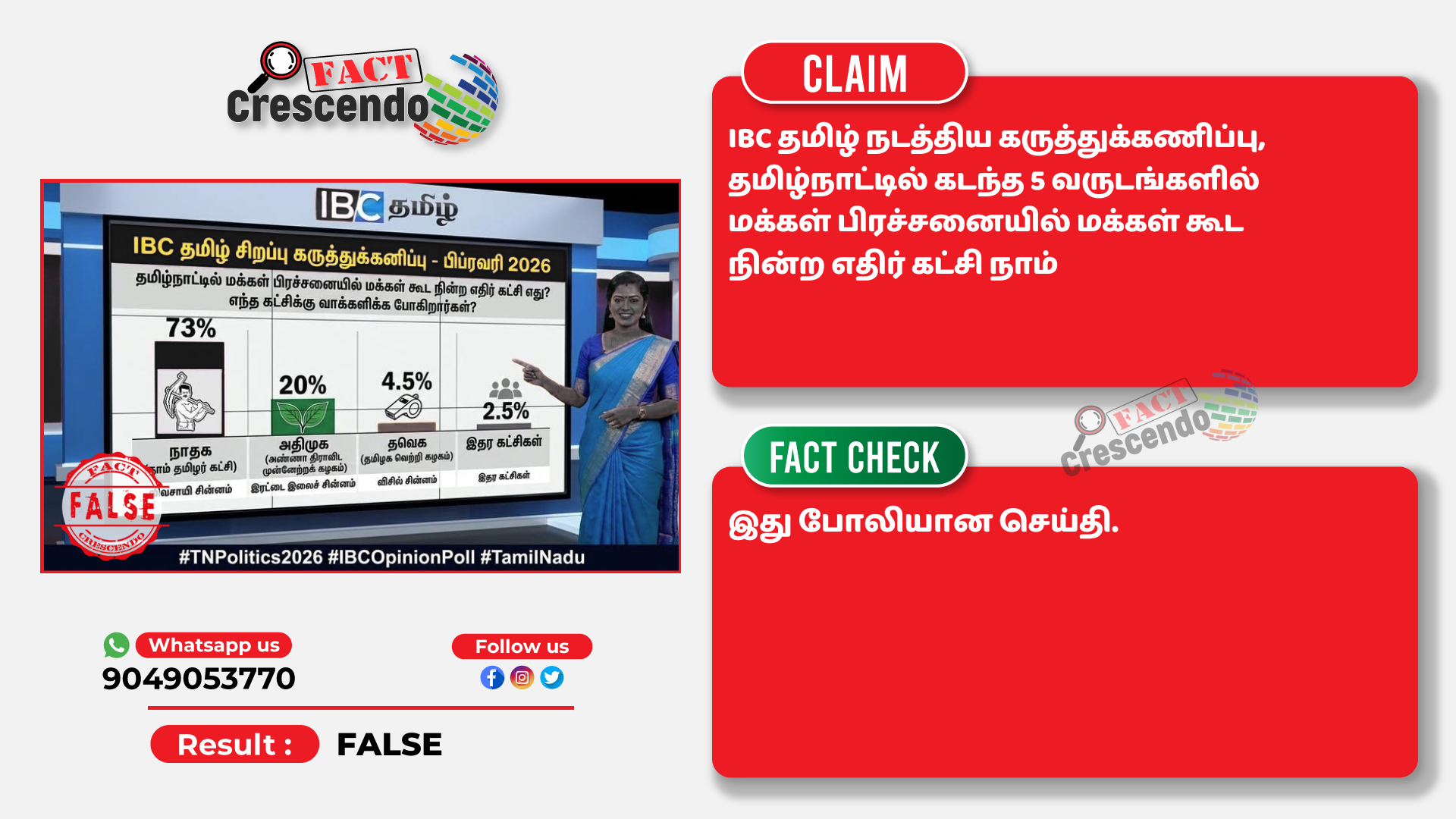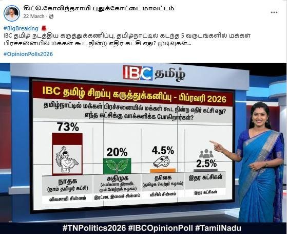 இதில், ‘’ IBC தமிழ் நடத்திய கருத்துக்கனிப்பு – பிப்ரவரி 2026. தமிழ்நாட்டில் கடந்த 5 வருடங்களில் மக்கள் பிரச்சனையில் மக்கள் கூட நின்ற எதிர் கட்சி எது? எந்த கட்சிக்கு வாக்களிக்க போகிறார்கள்? நாதக 73%, அதிமுக 20% தவெக 4.5%, இதர கட்சிகள் 2.5%,’’ என்று எழுதப்பட்டுள்ளது.