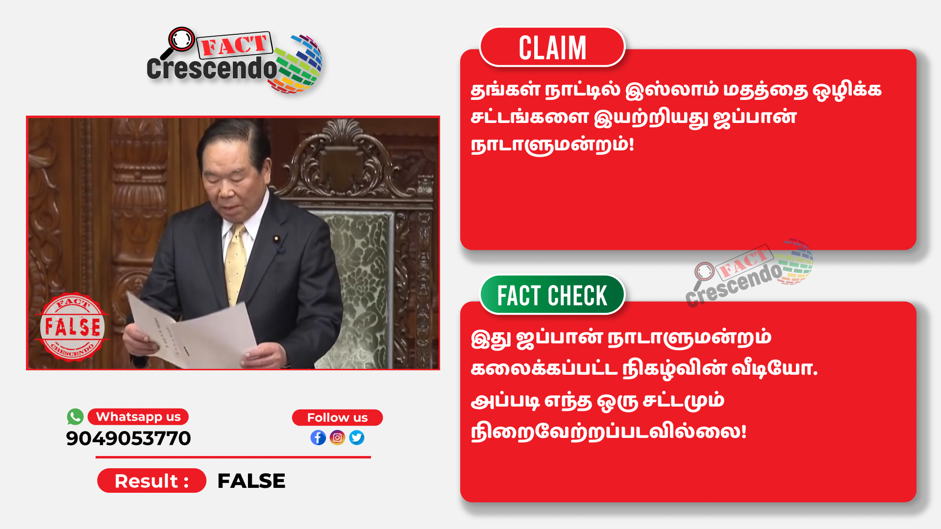 ஜப்பான் நாடாளுமன்றம் கலைக்கப்பட்ட நிகழ்வின் வீடியோவை தவறாக இஸ்லாம் மதத்தை தடை செய்த சட்டம் நிறைவேற்றிய ஜப்பான் நாடாளுமன்றம் என்று சமூக ஊடகங்களில் பகிர்ந்திருப்பதை தகுந்த ஆதாரங்கள் அடிப்படையில் ஃபேக்ட் கிரஸண்டோ தமிழ் உறுதி செய்துள்ளது. எனவே, இத்தகைய தவறான செய்தி, புகைப்படங்கள், வீடியோ போன்றவற்றை உறுதி செய்யாமல் மற்றவர்களுக்குப் பகிர வேண்டாம் என கேட்டுக் கொள்கிறோம். வாசகர்கள் தங்களுக்கு சந்தேகம் என்று தோன்றும் தகவல், பதிவு, புகைப்படம், வீடியோவை எங்களது வாட்ஸ் ஆப் எண்ணிற்கு (+91 9049053770) அனுப்பினால், அதுபற்றி ஆய்வு செய்து உண்மை விவரத்தை வெளியிடுகிறோம்.