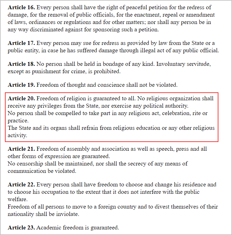 சரி, இதற்கு முன்பு இஸ்லாம் மதத்திற்கு எதிரான சட்டம் ஜப்பான் நாடாளுமன்றத்தில் நிறைவேற்றப்பட்டதா என்று அறிய கூகுளில் சில அடிப்படை வார்த்தைகளைப் பயன்படுத்தித் தேடினோம். ஆனால், அப்படி எந்த ஒரு சட்டமும் நிறைவேற்றப்பட்டதாக செய்திகளில் குறிப்பிடப்படவில்லை. ஜப்பான் அரசியலமைப்பு சட்டத்தில் இஸ்லாம் மதத்தைத் தடை செய்துள்ளார்களா என்று அறிய அந்நாட்டு அரசியலமைப்பு சட்டத்தை பார்வையிட்டோம். ஆர்டிகிள் 20 மத சுதந்திரம் பற்றிக் குறிப்பிடுகிறது.