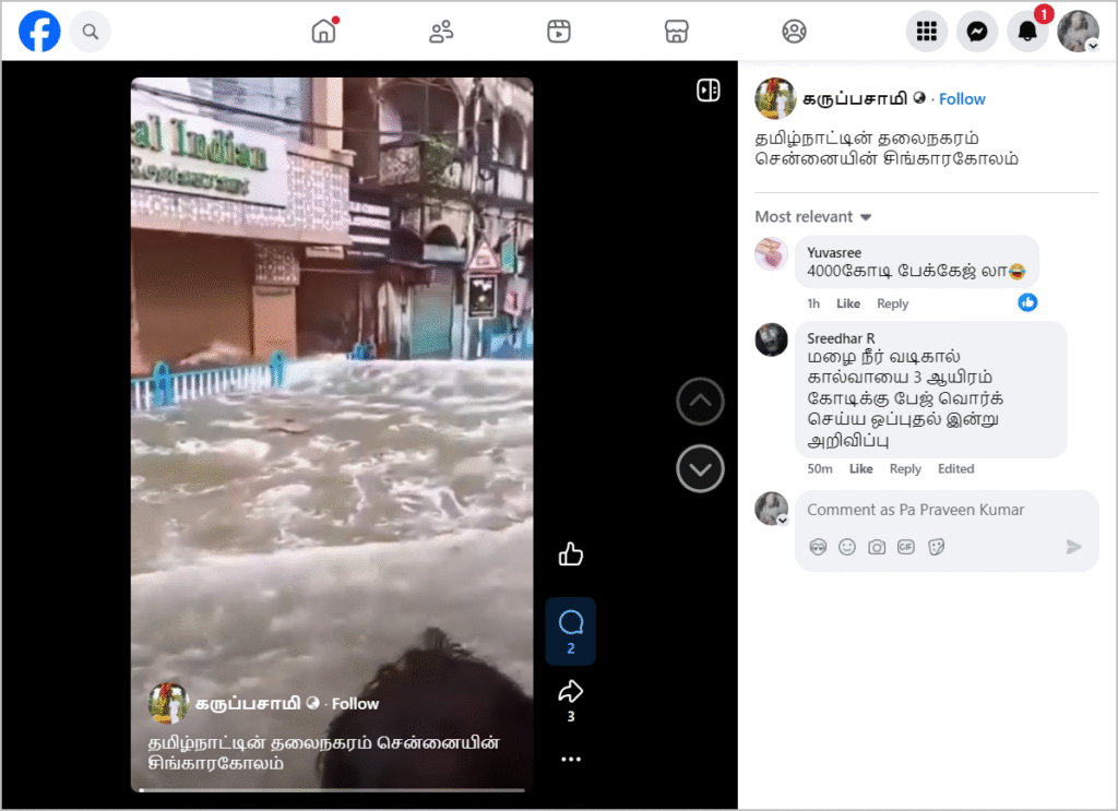 சாலையில் மழை வெள்ளம் போல் தேங்கியிருக்க, அதில் வாகனம் ஓட்டிச் செல்லும் வீடியோ ஃபேஸ்புக்கில் பதிவிடப்பட்டுள்ளது. நிலைத் தகவலில், “தமிழ்நாட்டின் தலைநகரம் சென்னையின் சிங்காரகோலம்” என்று குறிப்பிடப்பட்டிருந்தது. இந்த வீடியோவை பலரும் சமூக ஊடகங்களில் பதிவிட்டு வருகின்றனர்.