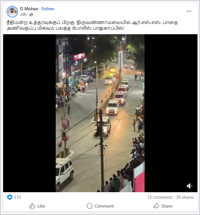 ஆர்எஸ்எஸ் தொண்டர்களின் பேரணி வீடியோ ஃபேஸ்புக்கில் பதிவிடப்பட்டுள்ளது. நிலைத் தகவலில், “நீதிமன்ற உத்தரவுக்குப் பிறகு, திருவண்ணாமலையில் ஆர்.எஸ்.எஸ். பாதை அணிவகுப்பு மிகவும் பலத்த போலீஸ் பாதுகாப்பில்!” என்று குறிப்பிடப்பட்டிருந்தது. இந்த வீடியோவை பலரும் சமூக ஊடகங்களில் பதிவிட்டு வருகின்றனர்.