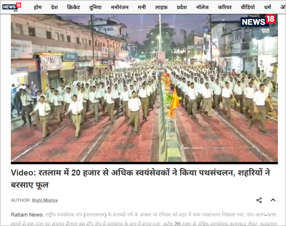 இந்த வீடியோவை புகைப்படங்களாக மாற்றி கூகுள் லென்ஸ் தளத்தில் பதிவேற்றித் தேடினோம். அப்போது இந்த வீடியோவை 2025 அக்டோபரில் பலரும் பதிவிட்டிருந்ததைக் காண முடிந்தது. அதில், மத்தியபிரதேச மாநிலம் ரத்லம் (Ratlam) என்ற இடத்தில் ஆர்எஸ்எஸ் தொண்டர்களின் பேரணி நடந்தது என்று குறிப்பிடப்பட்டிருந்தது. ஊடகங்களிலும் கூட இந்த பேரணி தொடர்பான செய்தி 2025 அக்டோபர் முதல் வாரத்தில் வெளியாகி இருந்தது. ரத்லமில் ஐந்து இடங்களில் இருந்து தொடங்கிய பேரணி பஸ் நிலையம் அருகே முடிந்தது என்று குறிப்பிடப்பட்டிருந்தது.