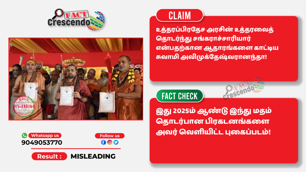 உத்தரப்பிரதேச அரசின் உத்தரவைத் தொடர்ந்து தான் சங்கராச்சாரியார் என்பதற்கான ஆதாரங்களை காட்டிய சுவாமி அவிமுக்தேஷ்வரானந்தா என்று பரவும் புகைப்படம் 2025 கும்ப மேளாவின் போது இந்து மதம் தொடர்பான பிரகடனத்தை அவர் வெளியிட்ட போது எடுக்கப்பட்டது என்பதை தகுந்த ஆதாரங்கள் அடிப்படையில் ஃபேக்ட் கிரஸண்டோ தமிழ் உறுதி செய்துள்ளது. எனவே, இத்தகைய தவறான செய்தி, புகைப்படங்கள், வீடியோ போன்றவற்றை உறுதி செய்யாமல் மற்றவர்களுக்குப் பகிர வேண்டாம் என கேட்டுக் கொள்கிறோம். வாசகர்கள் தங்களுக்கு சந்தேகம் என்று தோன்றும் தகவல், பதிவு, புகைப்படம், வீடியோவை எங்களது வாட்ஸ் ஆப் எண்ணிற்கு (+91 9049053770) அனுப்பினால், அதுபற்றி ஆய்வு செய்து உண்மை விவரத்தை வெளியிடுகிறோம்.