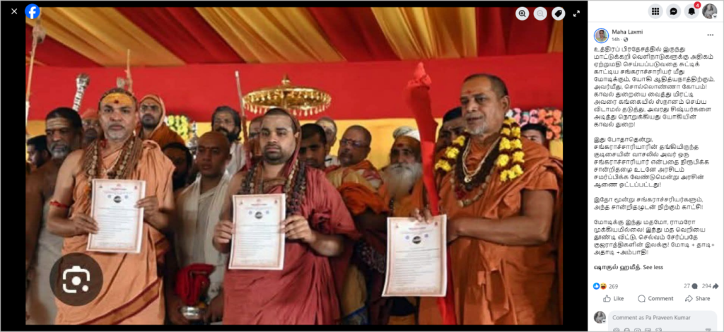 ஜோதிா்மடத்தின் பீடாதிபதி சுவாமி அவிமுக்தேஷ்வரானந்த் சரஸ்வதி சங்கராச்சாரியார் மற்றும் இருவருடன் சான்றிதழ் ஒன்றை பிடித்தபடி நிற்கும் புகைப்படம் ஃபேஸ்புக்கில் பதிவிடப்பட்டுள்ளது. நிலைத் தகவலில், “#உத்திரப் பிரதேசத்தில் இருந்து #மாட்டுக்கறி வெளிநாடுகளுக்கு அதிகம் ஏற்றுமதி செய்யப்படுவதை சுட்டிக் காட்டிய சங்கராச்சாரியர் மீது மோடிக்கும், யோகி ஆதித்யநாத்திற்கும், அவர்மீது, சொல்லொண்ணா கோபம்! காவல் துறையை வைத்து மிரட்டி அவரை கங்கையில் ஸ்நானம் செய்ய விடாமல் தடுத்து, அவரது சிஷ்யர்களை அடித்து நொறுக்கியது யோகியின் காவல் துறை!