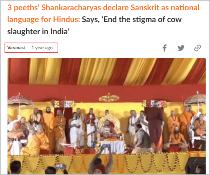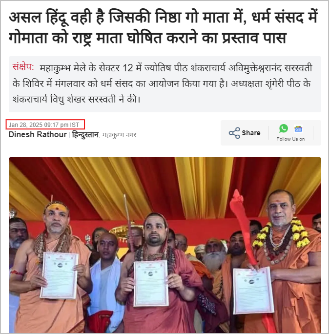 அந்த புகைப்படம் தொடர்பாக தேடிய போது, 2025ம் ஆண்டு நடந்த மகா கும்பமேளாவின் போது மூன்று சங்கராச்சாரியார்களும் இணைந்து ஒரு இந்து மத மாநாட்டை நடத்தினர். அதில் இந்துக்களின் தேசிய மொழியாக சமஸ்கிருதத்தை அறிவிப்பது, இந்தியா முழுவதும் பசு வதைகளை நிறுத்துவது என்பது உள்ளிட்ட 30 பிரகடனத்தை வெளியிட்டார்கள் என்று குறிப்பிடப்பட்டிருந்தது. இந்து மதம் தொடர்பான ஆணையை மூன்று சங்கராச்சாரியார்களும் வெளியிட்டதாக அந்த செய்திகளில் குறிப்பிடப்பட்டிருந்தது. அந்த பிரகடனத்தின் புகைப்படங்களும் கூட அப்போது வெளியாகி இருந்தது.