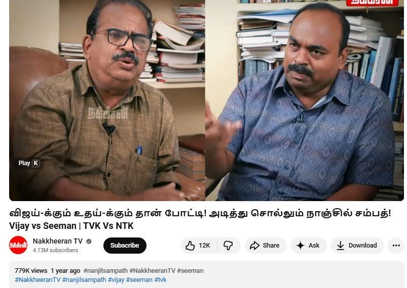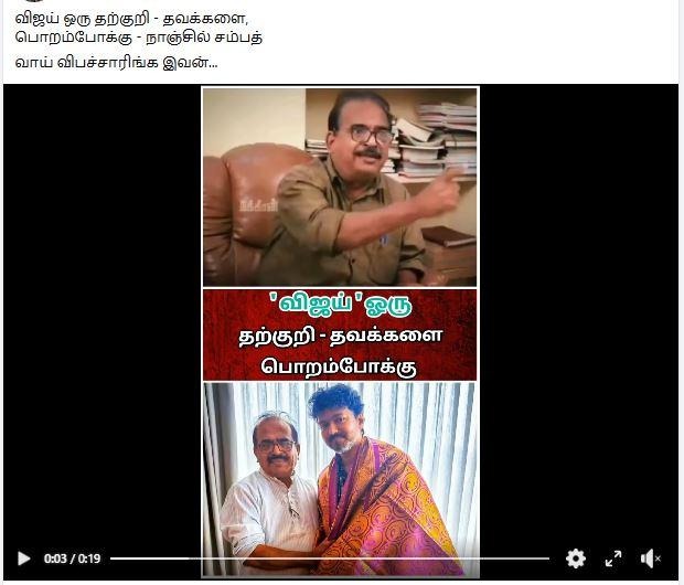 நக்கீரன் லோகோவுடன் உள்ள இந்த வீடியோவில், சீமான் பற்றி விமர்சித்து, நாஞ்சில் சம்பத் பேசுகிறார். இதனை எடுத்தே, விஜய் பற்றி அவர் பேசியதாகக் குறிப்பிட்டு, தவறான தகவல் பரப்புகிறார்கள்.