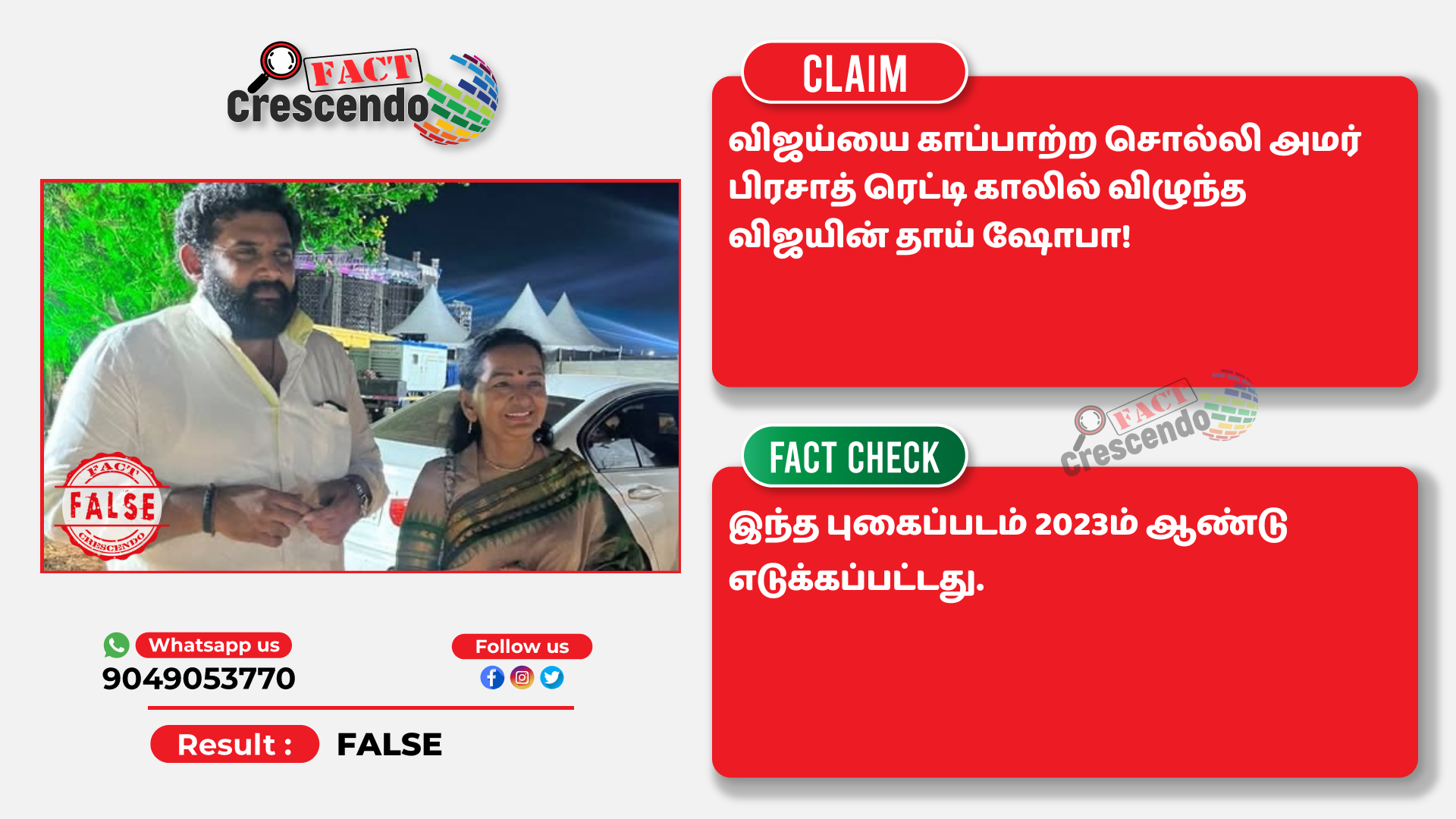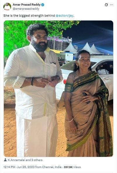 இதன்படி, கடந்த 2023ம் ஆண்டு Amar Prasad Reddy அவரது அதிகாரப்பூர்வ X வலைதள பக்கத்தில் குறிப்பிட்ட புகைப்படத்தை பகிர்ந்துள்ளார். அதற்கு, ‘’ She is the biggest strength behind @actorvijay ,’’ தலைப்பிட்டுள்ளார்.
