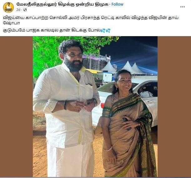 ‘’விஜய்யை காப்பாற்ற சொல்லி அமர் பிரசாத் ரெட்டி காலில் விழுந்த விஜயின் தாய் ஷோபா,’’ என்று கூறி, சமூக வலைதளங்களில் பகிரப்படும் ஒரு தகவல் பற்றி ஆய்வு மேற்கொண்டோம்.