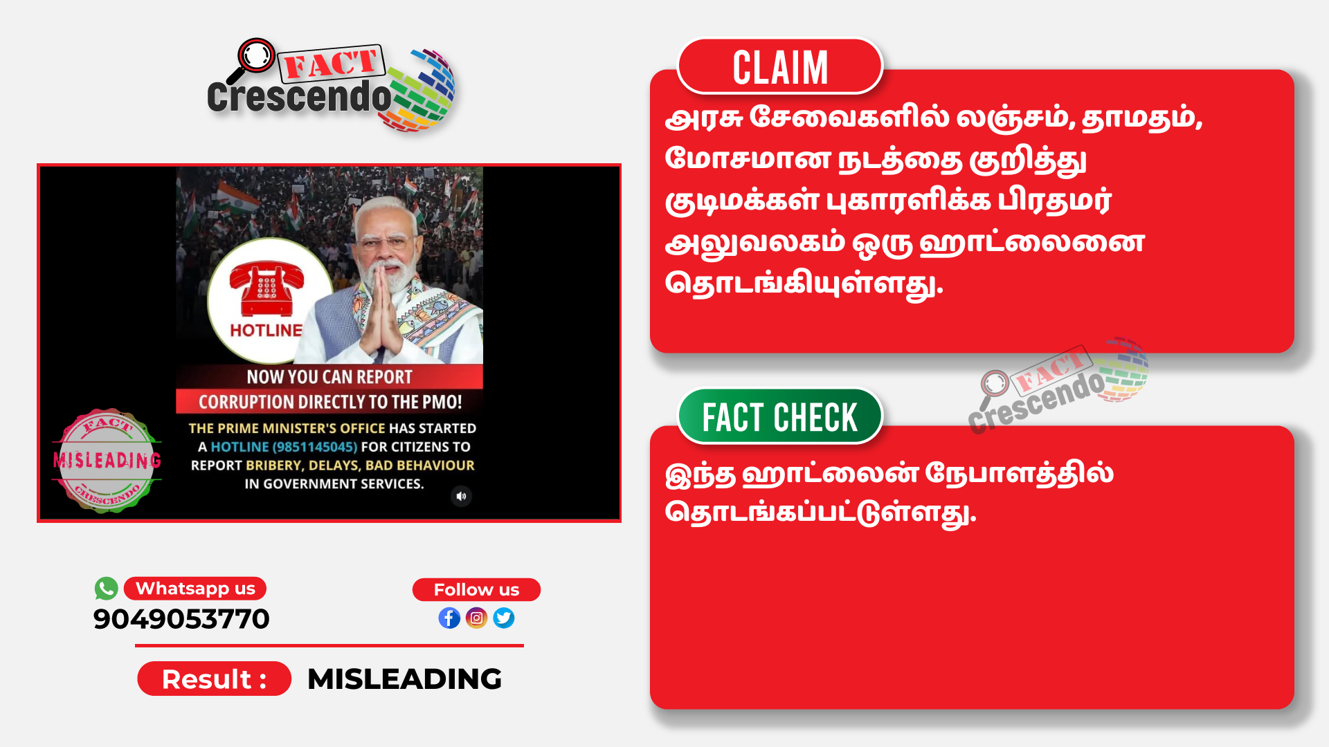 மேற்கண்ட தகவல் உண்மையா என்று நாம் ஆய்வு மேற்கொண்டோம். அப்போது, இதில் கூறப்பட்டுள்ள 9851145045 என்ற தொடர்பு எண் நேபாளம் நாட்டைச் சார்ந்த ஒன்று, என்பது தெரியவந்தது. ஆம், அரசு சேவைகளில் லஞ்சம், தாமதம், மோசமான நடத்தை குறித்து குடிமக்கள் புகாரளிக்க நேபாள பிரதமர் அலுவலகம் மேற்கண்ட ஹாட்லைனை ஏற்படுத்தியுள்ளது. இதற்கும், இந்தியாவுக்கும் எந்த சம்பந்தமும் இல்லை.