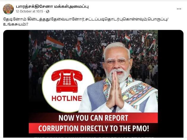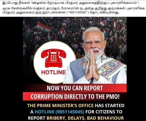 ‘’அரசு சேவைகளில் லஞ்சம், தாமதம், மோசமான நடத்தை குறித்து குடிமக்கள் புகாரளிக்க பிரதமர் அலுவலகம் ஒரு ஹாட்லைனை தொடங்கியுள்ளது,’’ என்று கூறி, சமூக வலைதளங்களில் பகிரப்படும் ஒரு தகவல் பற்றி ஆய்வு மேற்கொண்டோம்.
