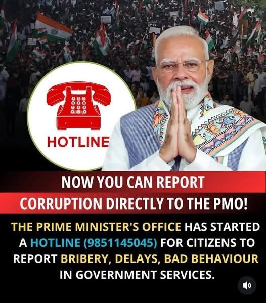 Title:இந்திய மக்கள் ஊழல் பற்றி புகார் செய்ய பிரதமர் அலுவலகம் ஹாட்லைன் தொடங்கியுள்ளதா?