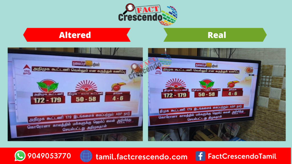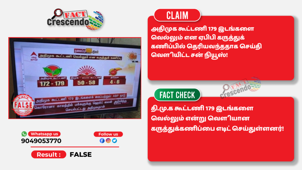 தி.மு.க கூட்டணி 179 இடங்களை வெல்லும் என்று வௌியான கருத்துக்கணிப்பை எடிட் செய்து அதிமுக கூட்டணி வெற்றிபெறும் என்று சன் டிவி-யே கூறிவிட்டது என்று தவறாக பகிர்ந்து வருவதை தகுந்த ஆதாரங்கள் அடிப்படையில் ஃபேக்ட் கிரஸண்டோ தமிழ் உறுதி செய்துள்ளது. எனவே, இத்தகைய தவறான செய்தி, புகைப்படங்கள், வீடியோ போன்றவற்றை உறுதி செய்யாமல் மற்றவர்களுக்குப் பகிர வேண்டாம் என கேட்டுக் கொள்கிறோம். வாசகர்கள் தங்களுக்கு சந்தேகம் என்று தோன்றும் தகவல், பதிவு, புகைப்படம், வீடியோவை எங்களது வாட்ஸ் ஆப் எண்ணிற்கு (+91 9049053770) அனுப்பினால், அதுபற்றி ஆய்வு செய்து உண்மை விவரத்தை வெளியிடுகிறோம்.