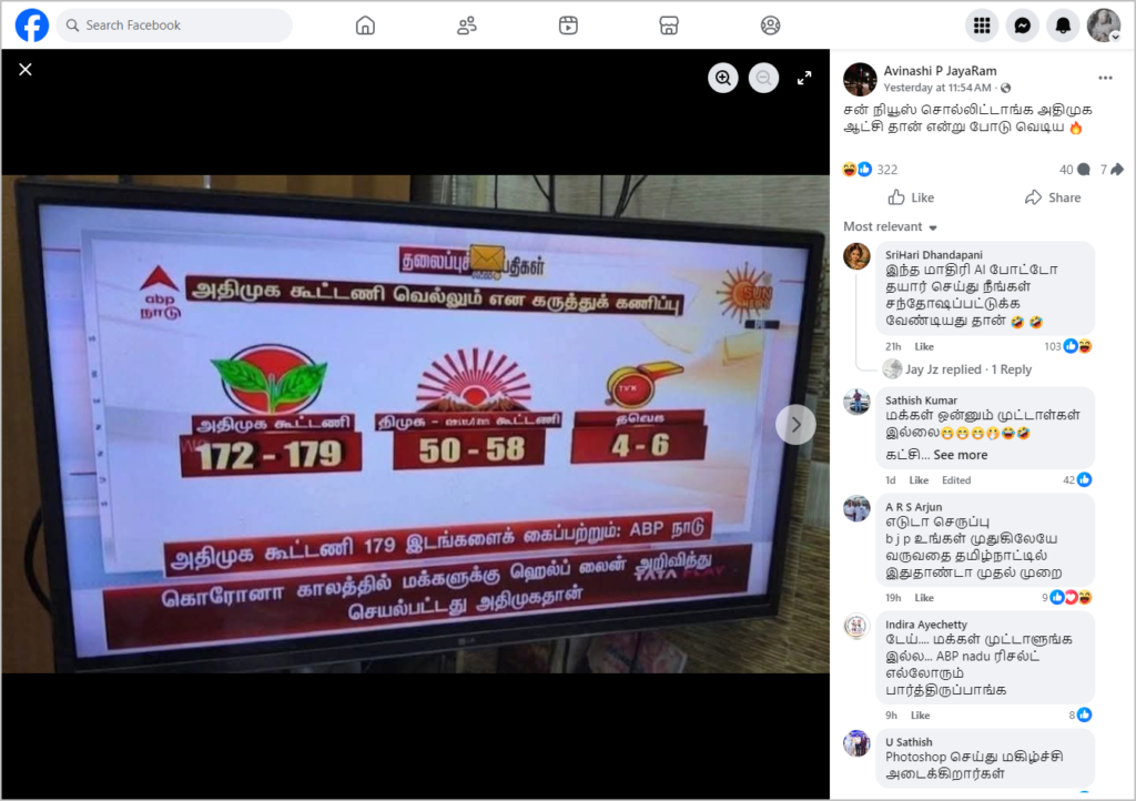 தொலைக்காட்சியில் ஒளிபரப்பான சன் நியூஸ் செய்தியை புகைப்படம் எடுத்து ஃபேஸ்புக்கில் பதிவிட்டுள்ளனர். அதில், “அதிமுக கூட்டணி வெல்லும் என கருத்துக் கணிப்பு. அதிமுக கூட்டணி 179 இடங்களைக் கைப்பற்றும்: ABP நாடு” என்று குறிப்பிடப்பட்டிருந்தது. இந்த படத்தைப் பலரும் சமூக ஊடகங்களில் பதிவிட்ட வருகின்றனர்.