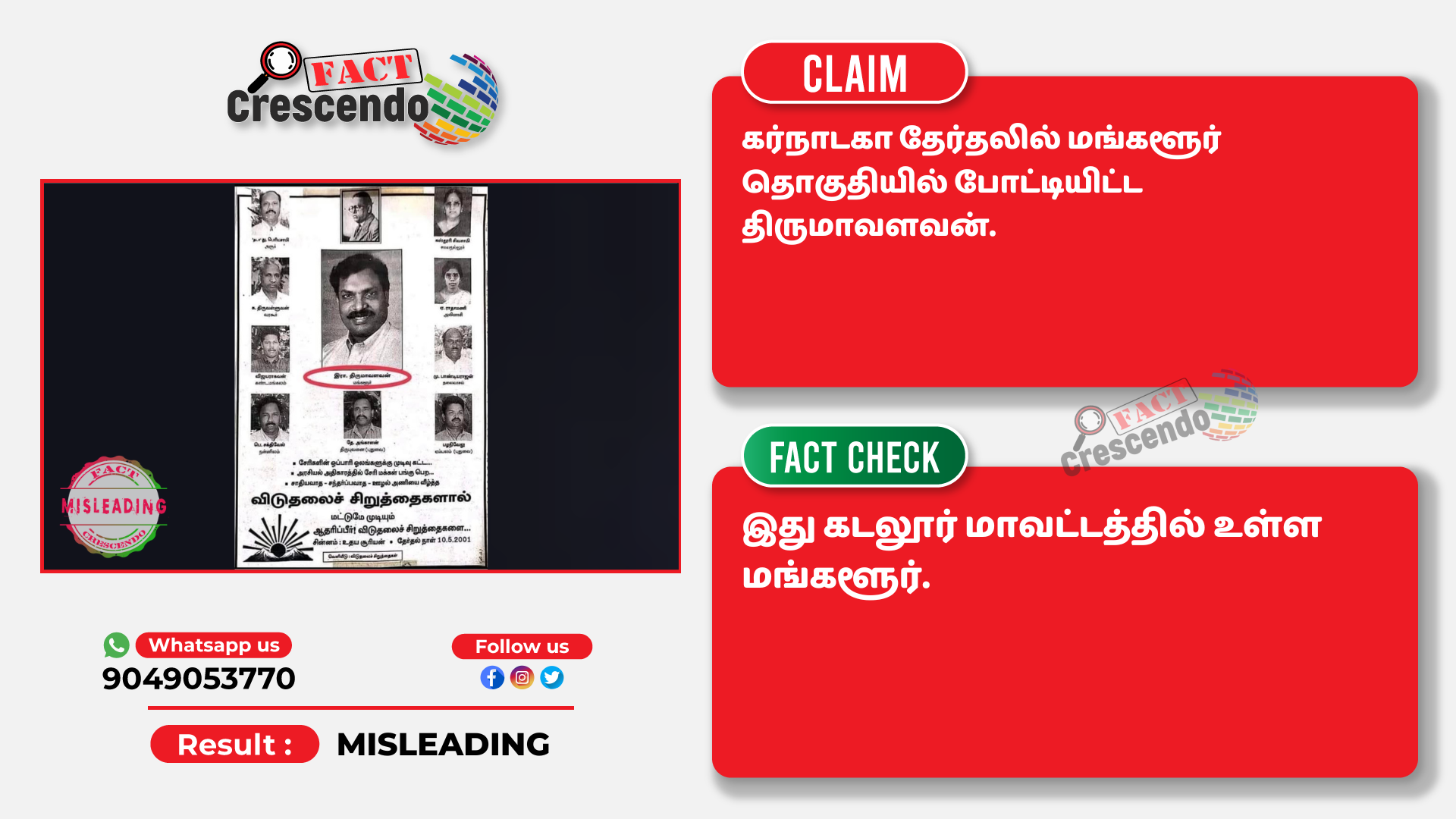 ‘‘கர்நாடகா தேர்தலில் போட்டியிட்ட திருமாவளவன்,’’ என்று கூறி, சமூக வலைதளங்களில் பகிரப்படும் ஒரு தகவல் பற்றி ஆய்வு மேற்கொண்டோம்.
