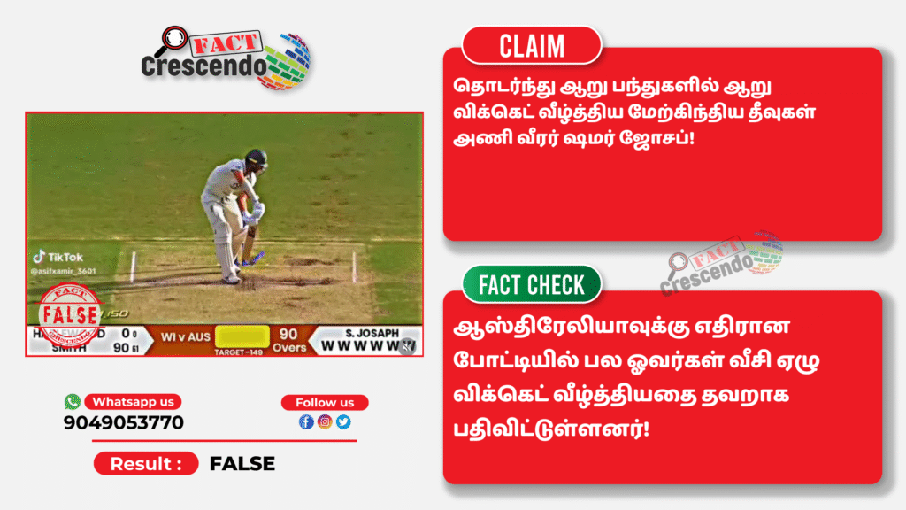 2024ம் ஆண்டு மேற்கு இந்திய தீவுகள் அணி வீரர் ஜோசப், ஆஸ்திரேலியாவுக்கு எதிரான போட்டியில் ஏழு விக்கெட் வீழ்த்தியதை தவறாக, தொடர்ந்து ஆறு பந்துகளில் ஆறு விக்கெட் வீழ்த்திய மேற்கு இந்திய தீவுகள் அணி வீரர் ஷமர் ஜோசப் என்று தவறாக சமூக ஊடகங்களில் பகிர்ந்திருப்பதை தகுந்த ஆதாரங்கள் அடிப்படையில் ஃபேக்ட் கிரஸண்டோ தமிழ் உறுதி செய்துள்ளது. எனவே, நமது வாசகர்கள், இத்தகைய தவறான செய்தி, புகைப்படங்கள், வீடியோ போன்றவற்றை உறுதி செய்யாமல் மற்றவர்களுக்குப் பகிர வேண்டாம் என கேட்டுக் கொள்கிறோம். வாசகர்கள் தங்களுக்கு சந்தேகம் என்று தோன்றும் தகவல், பதிவு, புகைப்படம், வீடியோவை எங்களது வாட்ஸ் ஆப் எண்ணிற்கு (+91 9049053770) அனுப்பினால், அதுபற்றி ஆய்வு செய்து உண்மை விவரத்தை வெளியிடுகிறோம்.