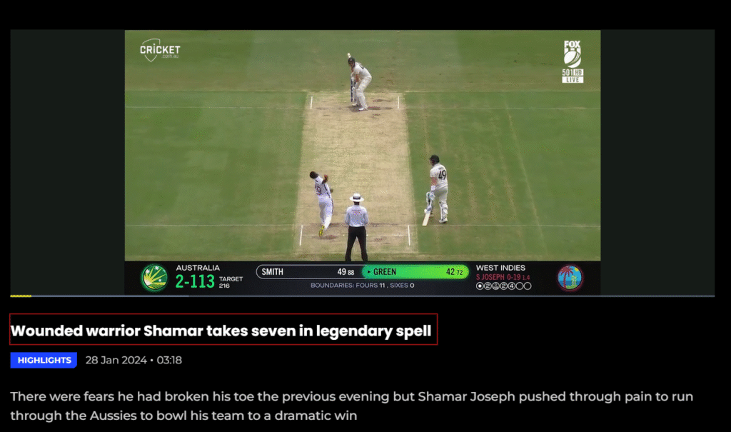 கூகுளில், ஷமர் ஜோசப், ஆஸ்திரேலியா – மே.இ.தீவுகள், 6 விக்கெட் என அடிப்படை வார்த்தைகள் சிலவற்றை ஆங்கிலத்தில் டைப் செய்து தேடினோம். அப்போது, ஆஸ்திரேலியாவுக்கு எதிரான போட்டியில் ஏழு விக்கெட் வீழ்த்திய ஜோசப் என்று குறிப்பிட்டு இதே வீடியோ 2024ம் ஆண்டு தொடக்கத்தில் சமூக ஊடகங்களில் பதிவிடப்பட்டிருந்ததைக் காண முடிந்தது. அதன் முழு வீடியோவை ஸ்டார் ஸ்போர்ட்ஸ் தன்னுடைய யூடியூப் பக்கத்தில் 2024 ஜனவரி 28ம் தேதி பதிவிட்டிருந்தது.