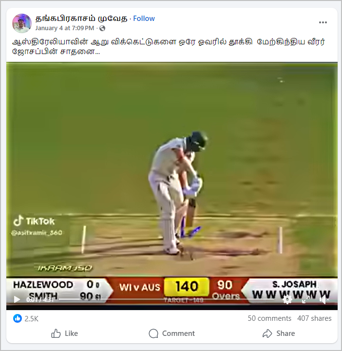 ஆஸ்திரேலியா – மேற்கு இந்திய தீவுகள் அணிகளுக்கு இடையேயான கிரிக்கெட் போட்டியில் மே.இ தீவுகள் அணியின் ஷமர் ஜோசப் (Shamar Joseph) தொடர்ந்து ஆறு பந்துகள் வீசி ஆறு விக்கெட் வீழ்த்தியது போன்று வீடியோ ஃபேஸ்புக்கில் பதிவிடப்பட்டுள்ளது. நிலைத் தகவலில், “ஆஸ்திரேலியாவின் ஆறு விக்கெட்டுகளை ஒரே ஓவரில் தூக்கி மேற்கிந்திய வீரர் ஜோசப்பின் சாதனை…” என்று குறிப்பிடப்பட்டிருந்தது. இந்த வீடியோவை பலரும் சமூக ஊடகங்களில் பதிவிட்டு வருகின்றனர்.