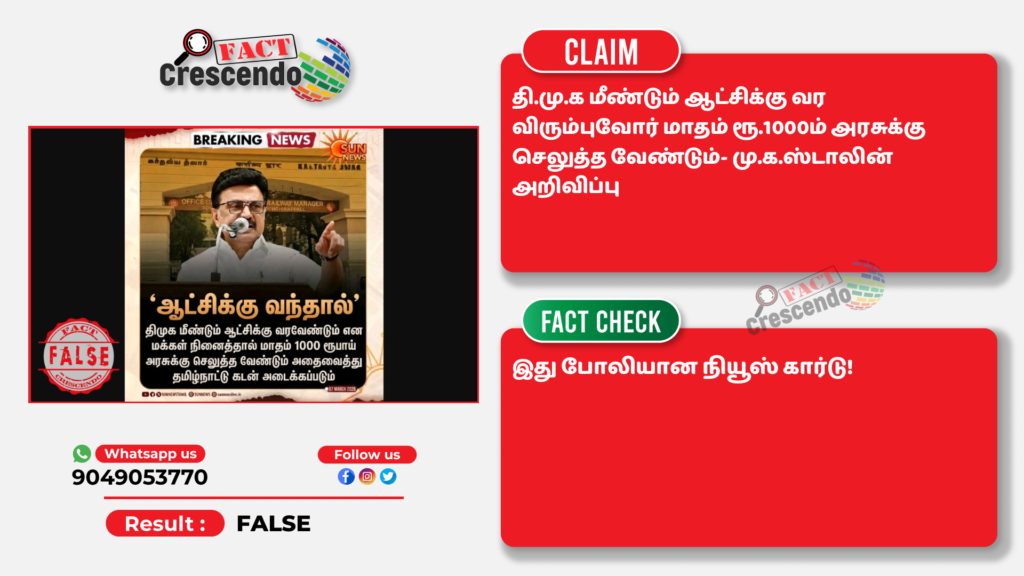 தமிழ்நாடு சட்டமன்ற தேர்தல் அறிவிப்பு வெளியாக உள்ள நிலையில் ஒவ்வொரு கட்சியும் மக்களுக்கு பல்வேறு இலவசங்களை போட்டிப் போட்டு அறிவித்து வருகின்றன. இந்த நிலையில் தமிழ்நாடு முதலமைச்சர் மு.க.ஸ்டாலின் மக்களிடமிருந்து மாதம் ரூ.1000ம் வசூலித்து தமிழ்நாடு அரசின் கடனை அடைக்க உள்ளதாக அறிவித்தது போன்று ஒரு நியூஸ் கார்டை பலரும் பதிவிட்டு வருகின்றனர்.