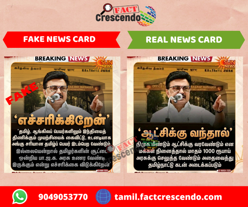 இப்படி ஒரு நியூஸ் கார்டை சன் நியூஸ் வெளியிட்டுள்ளதா என்று அறிய அதன் சமூக ஊடக பக்கங்களைப் பார்வையிட்டோம். அதில் அப்படி எந்த ஒரு நியூஸ் கார்டும் இல்லை. இந்த நியூஸ் கார்டை கூகுள் லென்ஸ் தளத்தில் பதிவேற்றித் தேடினோம். அப்போது, இதே போன்ற ஒரு நியூஸ் கார்டை சன் நியூஸ் 2026 மார்ச் 4ம் தேதி வெளியிட்டிருந்தது தெரிந்தது. திருச்சி ரயில்வே அலுவலகத்தில் இந்தி மொழியில் பெயர் பலகை வைக்கப்பட்டதற்கு எதிர்ப்பு தெரிவித்து ஸ்டாலின் விடுத்திருந்த எச்சரிக்கை தொடர்பான செய்தி அதிலிருந்தது. அந்த நியூஸ் கார்டை எடிட் செய்து விஷமத்தனமான தவறான தகவல் சேர்த்து சமூக ஊடகங்களில் பகிர்ந்திருப்பது தெளிவானது.