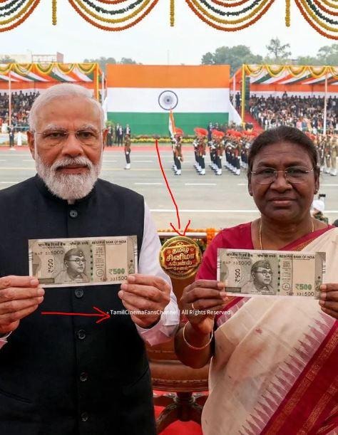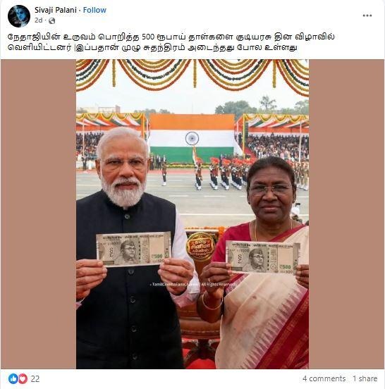 இதில், ‘’ நேதாஜியின் உருவம் பொறித்த 500 ரூபாய் தாள்களை குடியரசு தின விழாவில் வெளியிட்டனர் |இப்பதான் முழு சுதந்திரம் அடைந்தது போல உள்ளது’’ என்று எழுதப்பட்டுள்ளது.