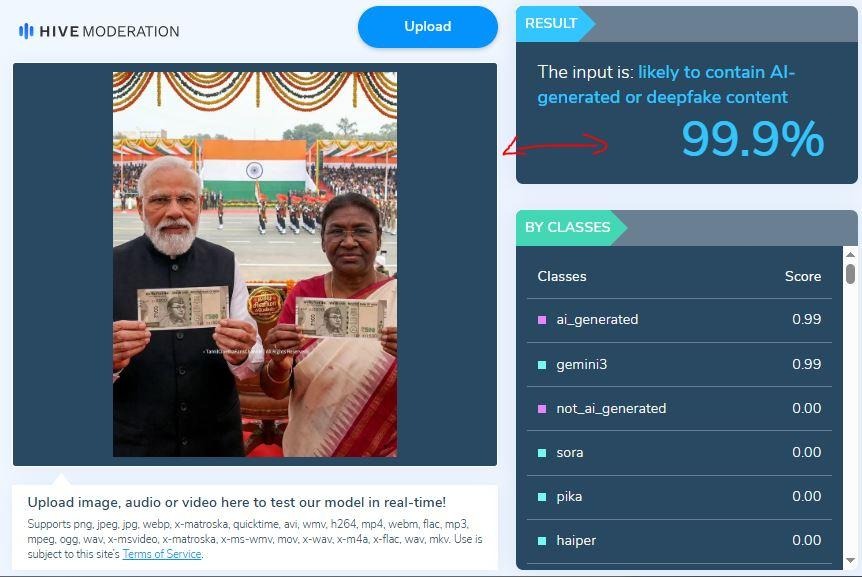கூடுதல் ஆதாரத்திற்காக, hivemoderation, wasitai ஆகிய இணையதளங்கள் மூலம் மேற்கண்ட புகைப்படத்தை பகுப்பாய்வு செய்தோம். இது AI உதவியுடன் தயாரிக்கப்பட்டதுதான், என்று உறுதி செய்யப்பட்டது.