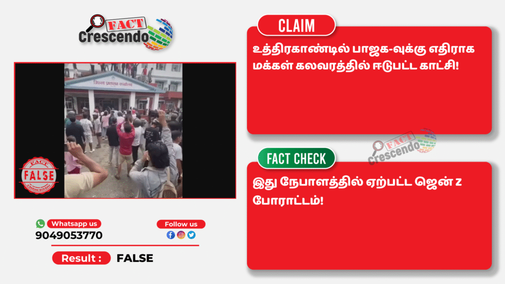நேபாள போராட்ட புகைப்படத்தை உத்திரகாண்டில் பாஜக-வுக்கு எதிரான போராட்டம் என்று தவறாக பதிவிட்டிருப்பதை தகுந்த ஆதாரங்கள் அடிப்படையில் ஃபேக்ட் கிரஸண்டோ தமிழ் உறுதி செய்துள்ளது. எனவே, நமது வாசகர்கள், இத்தகைய தவறான செய்தி, புகைப்படங்கள், வீடியோ போன்றவற்றை உறுதி செய்யாமல் மற்றவர்களுக்குப் பகிர வேண்டாம் என கேட்டுக் கொள்கிறோம். வாசகர்கள் தங்களுக்கு சந்தேகம் என்று தோன்றும் தகவல், பதிவு, புகைப்படம், வீடியோவை எங்களது வாட்ஸ் ஆப் எண்ணிற்கு (+91 9049053770) அனுப்பினால், அதுபற்றி ஆய்வு செய்து உண்மை விவரத்தை வெளியிடுகிறோம்.