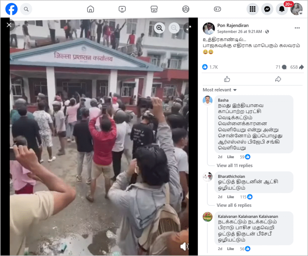 அரசு அலுவலகத்தை இளைஞர்கள் கைப்பற்றி கொண்டாடியது போன்று புகைப்படம் ஃபேஸ்புக்கில் பதிவிடப்பட்டுள்ளது. நிலைத் தகவலில், “உத்திரகாண்டில்… பாஜகவுக்கு எதிராக மாபெரும் கலவரம்” என்று குறிப்பிடப்பட்டிருந்தது. இந்த புகைப்படத்தை பலரும் சமூக ஊடகங்களில் பகிர்ந்து வருகின்றனர்.