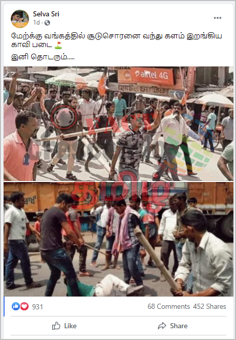 கையில் கட்டை உள்ளிட்ட ஆயுதங்களுடன் சென்று மக்களை தாக்கும் காலிகள் படங்கள் பகிரப்பட்டுள்ளன. நிலைத் தகவலில், “மேற்க்கு வங்கத்தில் சூடுசொரனை வந்து களம் இறங்கிய காவி படை ⛳ இனி தொடரும்….” என்று குறிப்பிடப்பட்டுள்ளது. இந்த பதிவை Selva Sri என்ற ஃபேஸ்புக் ஐடி கொண்ட நபர் 2021 மே 6ம் தேதி பதிவிட்டுள்ளார். பலரும் இதை ஷேர் செய்து வருகின்றனர்.