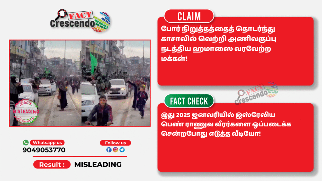 2025 ஜனவரியில் இஸ்ரேலிய பெண் ராணுவ வீரர்களை ஒப்படைக்க சென்றபோது எடுக்கப்பட்ட வீடியோவை போர் நிறுத்த வெற்றிப் பேரணி என்று தவறாக பகிர்ந்திருப்பதை தகுந்த ஆதாரங்கள் அடிப்படையில் ஃபேக்ட் கிரஸண்டோ தமிழ் உறுதி செய்துள்ளது. எனவே, நமது வாசகர்கள், இத்தகைய தவறான செய்தி, புகைப்படங்கள், வீடியோ போன்றவற்றை உறுதி செய்யாமல் மற்றவர்களுக்குப் பகிர வேண்டாம் என கேட்டுக் கொள்கிறோம். வாசகர்கள் தங்களுக்கு சந்தேகம் என்று தோன்றும் தகவல், பதிவு, புகைப்படம், வீடியோவை எங்களது வாட்ஸ் ஆப் எண்ணிற்கு (+91 9049053770) அனுப்பினால், அதுபற்றி ஆய்வு செய்து உண்மை விவரத்தை வெளியிடுகிறோம்.