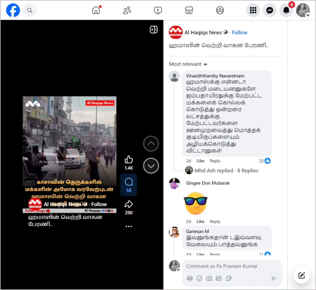 கார்களில் துப்பாக்கி ஏந்திய பலர் அணிவகுத்து வர அதை ஒரு பெண் வரவேற்பது போன்று வீடியோ ஃபேஸ்புக்கில் பதிவிடப்பட்டுள்ளது. வீடியோவில் “காசாவின் தெருக்களில் மக்களின் அமோக வரவேற்புடன் ஹமாஸின் வெற்றி வாகன அணிவகுப்பு” என்று குறிப்பிடப்பட்டிருந்தது. நிலைத் தகவலில், “ஹமாஸின் வெற்றி வாகன பேரணி..” என்று குறிப்பிடப்பட்டிருந்தது.