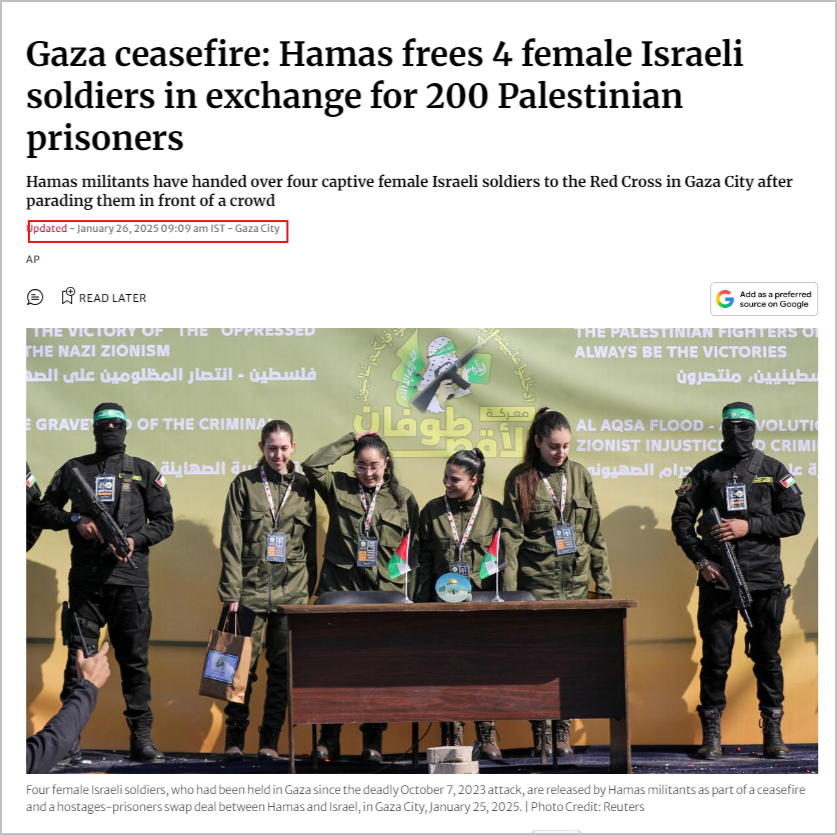 அந்த செய்திகளில், “இஸ்ரேல் சிறையிலிருந்து 200 பாலஸ்தீனிய கைதிகள் விடுதலை செய்யப்பட்டதைத் தொடர்ந்து, நான்கு இஸ்ரேலிய பெண் ராணுவ வீரர்களை விடுதலைச் செய்த ஹமாஸ் என்று” என்று குறிப்பிடப்பட்டிருந்தது. இதன் மூலம் இது 2025 அக்டோபரில் மேற்கொள்ளப்பட்ட போர் நிறுத்த ஒப்பந்தத்தைத் தொடர்ந்து ஹமாஸ் நடத்திய வெற்றி அணிவகுப்பு இல்லை என்பது உறுதியாகிறது.