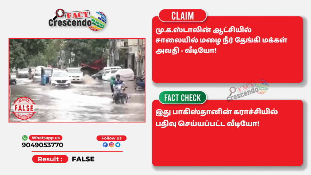 கராச்சி சாலையில் மழை நீர் தேங்கிய வீடியோவை தமிழ்நாட்டில் ஸ்டாலின் ஆட்சியில் சாலையில் நிலை என்று தவறாக பகிர்ந்திருப்பதை தகுந்த ஆதாரங்கள் அடிப்படையில் ஃபேக்ட் கிரஸண்டோ தமிழ் உறுதி செய்துள்ளது. எனவே, நமது வாசகர்கள், இத்தகைய தவறான செய்தி, புகைப்படங்கள், வீடியோ போன்றவற்றை உறுதி செய்யாமல் மற்றவர்களுக்குப் பகிர வேண்டாம் என கேட்டுக் கொள்கிறோம். வாசகர்கள் தங்களுக்கு சந்தேகம் என்று தோன்றும் தகவல், பதிவு, புகைப்படம், வீடியோவை எங்களது வாட்ஸ் ஆப் எண்ணிற்கு (+91 9049053770) அனுப்பினால், அதுபற்றி ஆய்வு செய்து உண்மை விவரத்தை வெளியிடுகிறோம்.