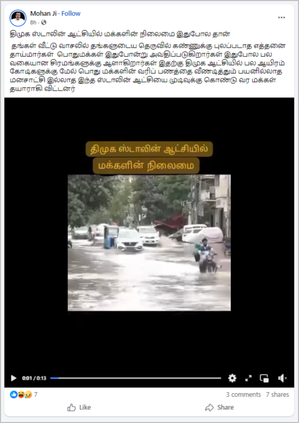சாலையில் தேங்கியிருக்கும் மழை நீரில் பைக் ஓட்டிக்கொண்டு ஒருவர் வர, திடீரென்று நிலை தடுமாறி பின்னால் அமர்ந்திருந்த பெண் மற்றும் குழந்தை கீழே விழுந்த வீடியோ ஃபேஸ்புக்கில் பதிவிடப்பட்டுள்ளது. வீடியோவில், “திமுக ஸ்டாலின் ஆட்சியில் மக்களின் நிலைமை” என்று குறிப்பிடப்பட்டிருந்தது.