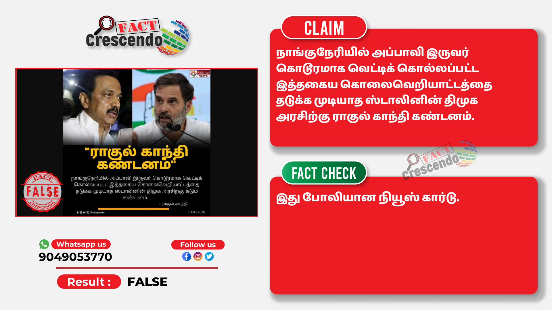 உரிய ஆதாரங்களின் அடிப்படையில் மேற்கண்ட தகவல் நம்பகமானது இல்லை என்று ஃபேக்ட் கிரஸண்டோ தமிழ் நிரூபித்துள்ளது. நமது வாசகர்கள் இத்தகைய தவறான செய்தி, புகைப்படம் மற்றும் வீடியோவை கண்டால், எங்களது வாட்ஸ் ஆப் எண்ணிற்கு (+91 9049053770) அனுப்புங்கள். நாங்கள், அதுபற்றி ஆய்வு செய்து உண்மை விவரத்தை வெளியிடுகிறோம்.